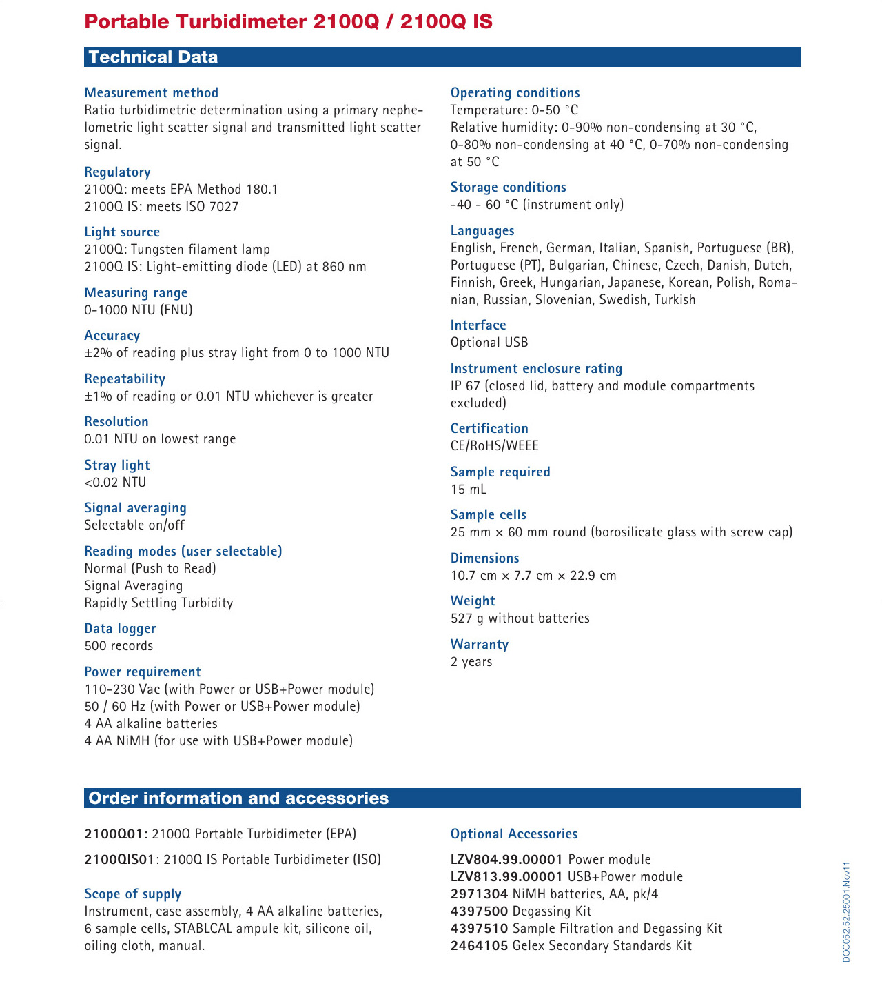 2100QMétodo de medición: relación turbidimétrica usando una señal de dispersión de luz nefelométrica primaria (90) a la señal de dispersión de luz transmitida.