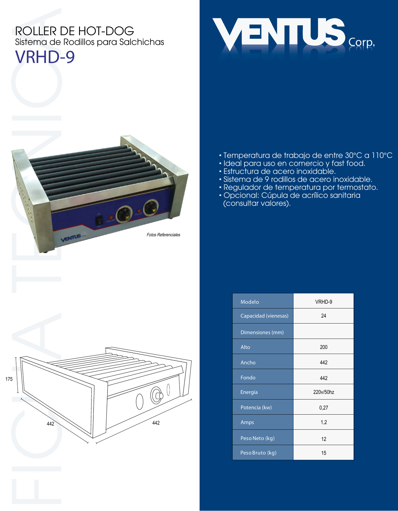 Energía (V/Hz): 220/50item: ven – CALENTADOR DE HOT DOG | LINEA CALOR | ROLLER HOT DOG | CALENTADOR DE HOT DOG DE 9 RODILLOS