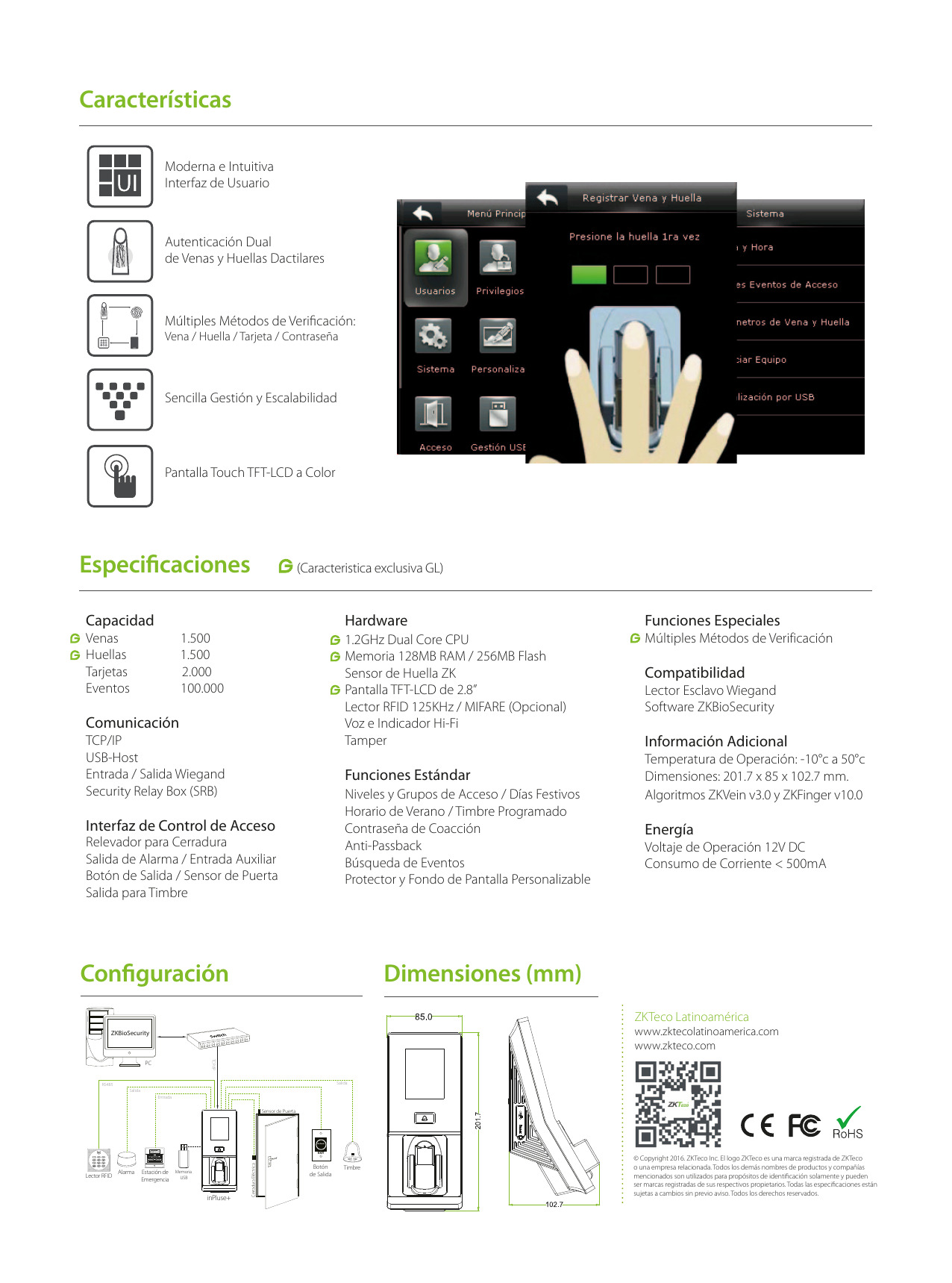 Funciones especiales Modos de verificación biométricos múltiples, tarjeta encriptada ZK (opcional)