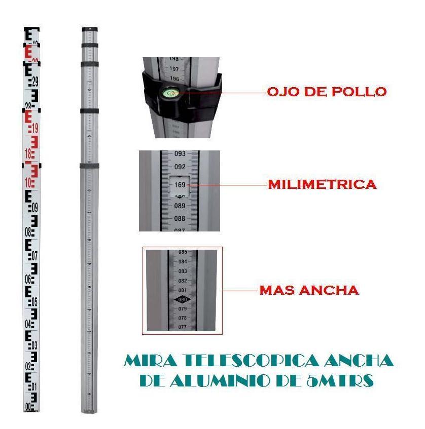 Miras telescópicas de aluminio, son muy ligeras y duraderas, impresas con tintas resistentes a la corrosión. Permite leer a distancias sin problemas, son resistentes al desgaste, permite hacer lecturas en centímetros y en milímetros gracias a que su estructura es mucho más ancha.