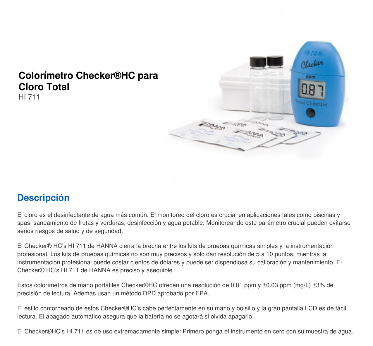 El HI711 Comprobador ® HC (orientable Colorímetro) proporciona una manera simple, precisa y rentable para medir el cloro total. El cloro es un desinfectante popular que se usa en el agua municipal, frutas y verduras, así como también en equipos en la industria de alimentos y bebidas. Si bien es beneficioso para destruir patógenos, los niveles superiores a 4 partes por millón (ppm) son perjudiciales para los humanos y, por lo tanto, deben ser monitoreados. Diseñado como una alternativa más precisa a los kits de pruebas químicas, el HI711 brinda resultados rápidos y precisos en unos pocos y sencillos pasos.