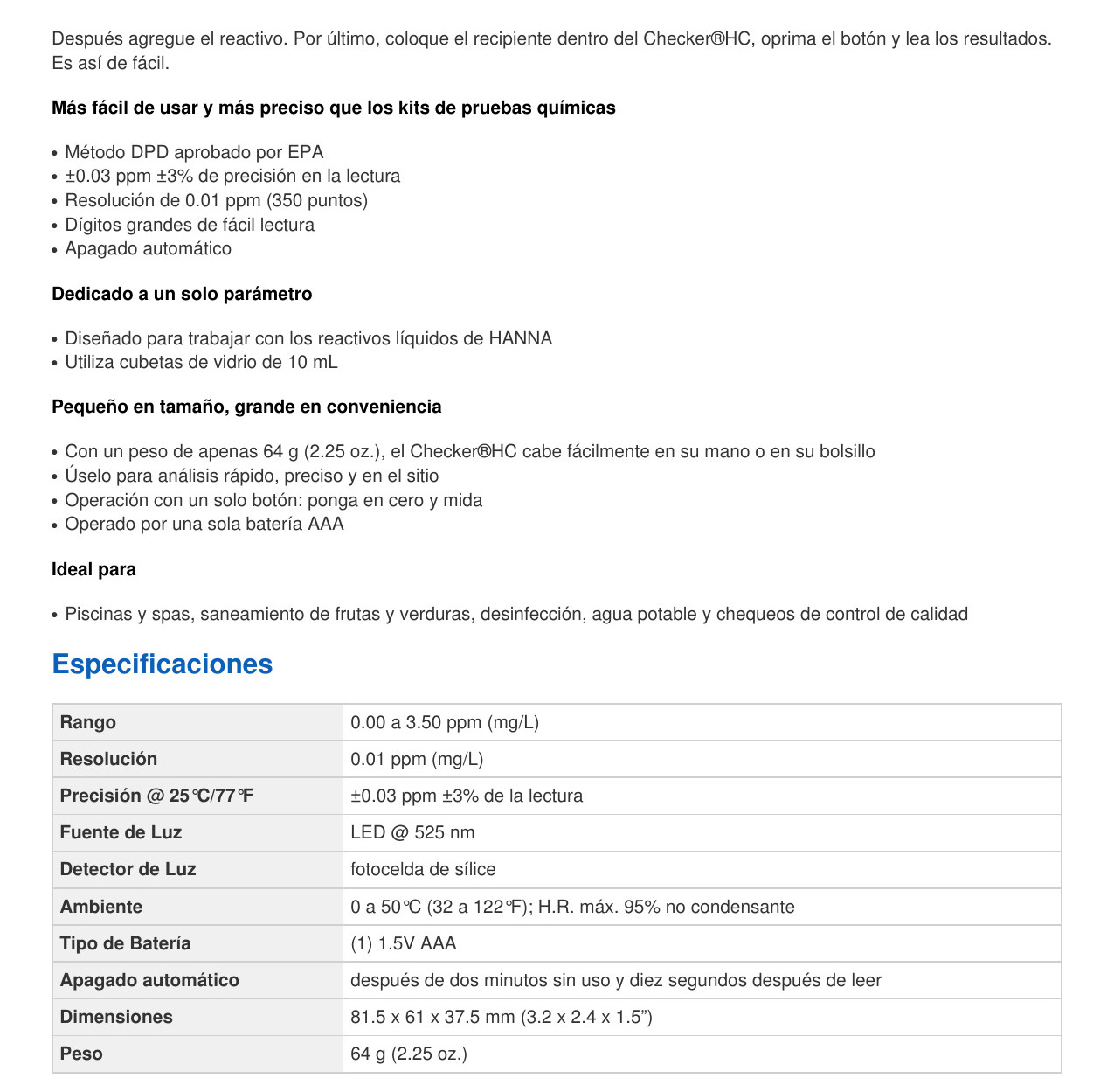 Ideal para: Calidad del Agua, Educación, Piscina y Spa.