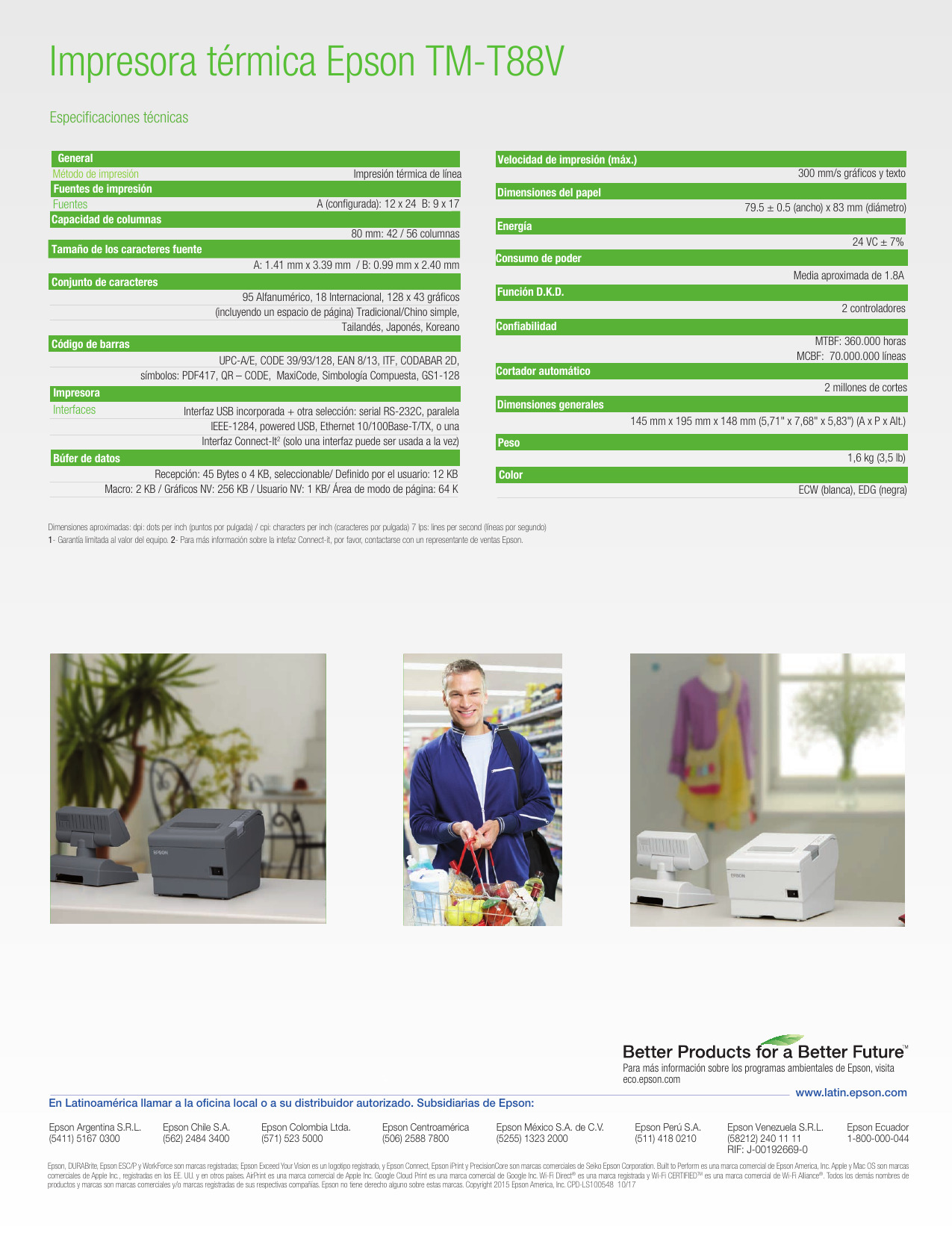La impresora Epson TM-T88V te proporciona más velocidad y funciones para los entornos de servicio dedicados a alimentos y comercio minorista. Acelera el crecimiento de tu punto de venta con la TM-T88V, ya que podrás imprimir recibos y gráficos a una velocidad de hasta 300 mm1 /s, es decir, un 50% más rápido que la TM-T88IV y con una alta resolución. Además, es la primera impresora en la industria en ofrecer 16 niveles de escala de grises, lo cual garantiza gráficos claros y nítidos. Es la más confiable en su categoría, ya que tiene un ciclo de vida útil de 70 millones de líneas y una vida útil del cortador automático de 2 millones de cortes. Todos estos se convierten en factores claves para los entornos con altos volúmenes de impresión.