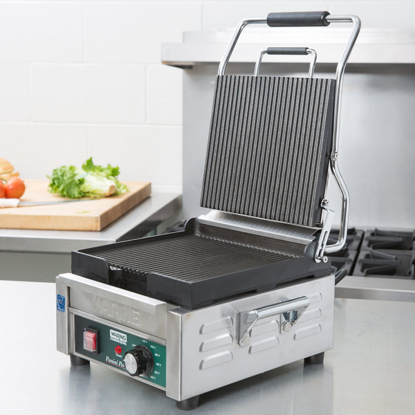 Prepare sándwiches de panini perfectamente asados y más con la parrilla Panini de estilo italiano compacta 120 W Waring® WPG150. Las placas ranuradas de hierro fundido se calientan uniformemente y rápidamente cocinan sándwiches, hamburguesas, pollo y verduras de hasta 3 «de espesor. Su cuerpo de acero inoxidable cepillado y su bandeja de goteo extraíble son fáciles de limpiar. Incluye termostato ajustable a 570 ° F junto con POWER y READY direccionales.