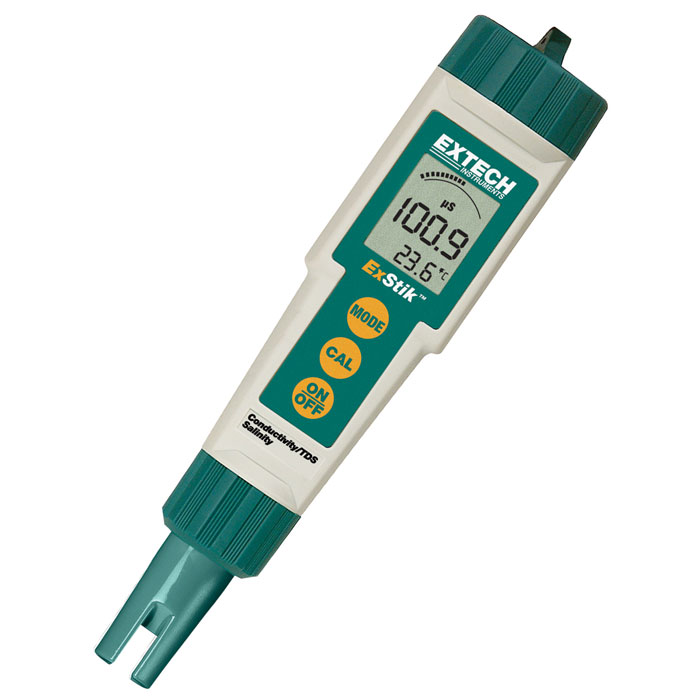 El Exechik EC400 de Extech cuenta con seis unidades de medida (µS / cm, mS / cm, ppm, ppt, mg / L yg / L), memoria interna que almacena hasta 15 lecturas etiquetadas para una fácil recuperación, conductividad ajustable a relación TDS factor de 0,4 a 1,0, 0,5 relación de salinidad fija y autocalibración en el encendido.