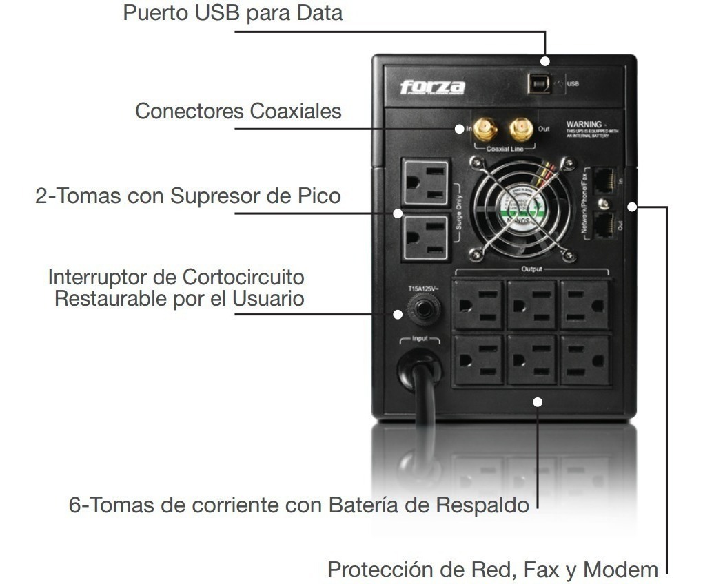 Incluye protección de sobretensión coaxial y pantalla de LCD, además del sistema de respaldo de energía (UPS) para darle tiempo de guardar sus datos importantes y apagar su equipo adecuadamente cuando falla el suministro.