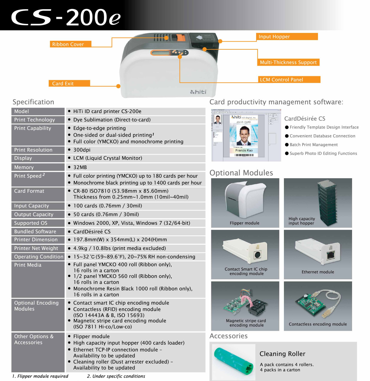 La impresora de tarjetas Hiti CS200e le permite imprimir las tarjetas plásticas (PVC) fácilmente, a óptima calidad, en una y ambas caras (con el módulo opcional ‘flipper’), estas pueden ser tarjetas personalizadas de identificación (fotochecks de acceso/asistencia), de crédito, de membresía, etc.