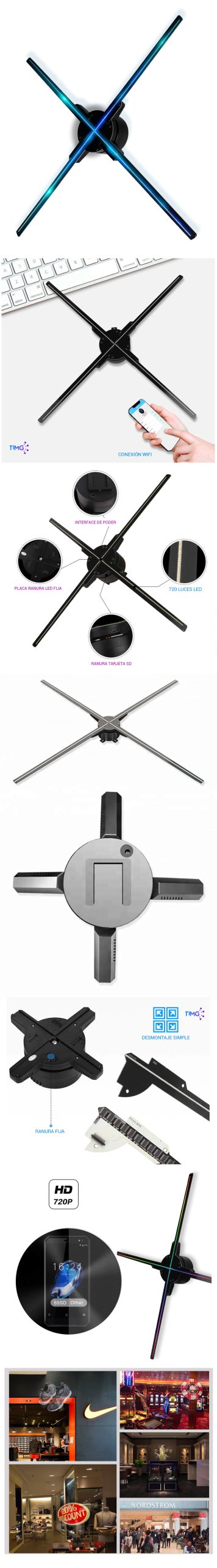El proyector holográfico Z3 le permite la proyección de imagenes en 3D con iluminación LED, el dispositivo es capaz de reproducir diseños y animaciones y proyectarlas a través de proyección LED creando atractivas soluciones que pueden ser utilizadas en el ámbito de la publicidad, la promoción o simplemente como decoración.