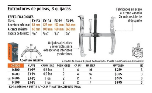 Empaque: Cajaitem: tru – EXTRACTOR DE POLEAS | EXTRACTOR DE POLEAS 3 BRAZOS | EXTRACTOR TORNILLO CON PUNTA | EXTRACTOR CON BRAZOS FORJADOS DE ACERO