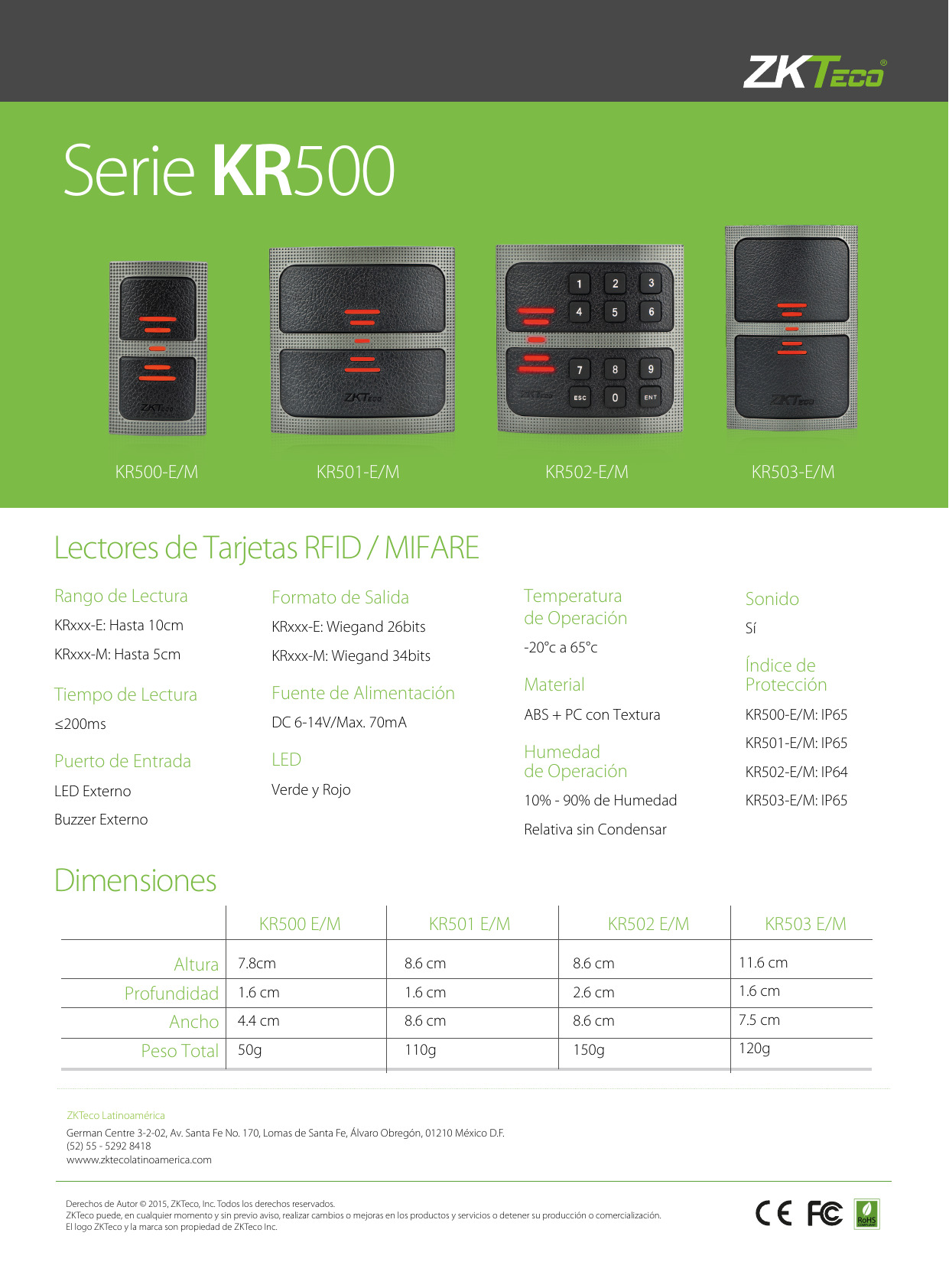 Hora <300ms Formato de salida Modelos E Wiegand de 26 bits Modelos m Wiegand de 34 bits LED Indicador LED de 2 colores rojo y verde Temperatura de funcionamiento ° C -10 ° a + 70 ° C