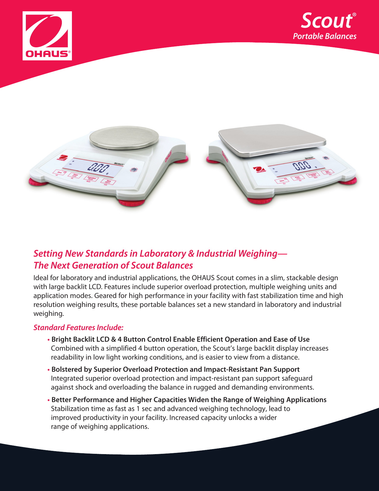 La próxima generación de balanzas Scout establece el estándar para aplicaciones de pesaje de laboratorio e industriales. Estas balanzas portátiles continúan el legado de la serie Scout y agregan nuevas y emocionantes mejoras de diseño. Las balanzas portátiles OHAUS SPX Scout cuentan con un diseño delgado y apilable y una pantalla LCD retroiluminada más grande. La protección contra sobrecargas líder en la industria y la bandeja resistente al impacto, los rápidos tiempos de estabilización, las múltiples unidades de pesaje y una precisión superior hacen que el Scout sea una opción obvia para el pesaje industrial y de laboratorio. Las balanzas Scout son fáciles y convenientes de usar en el campo con el funcionamiento de la batería (4 baterías AA no incluidas) por hasta 120 horas. Un adaptador de CA está incluido.