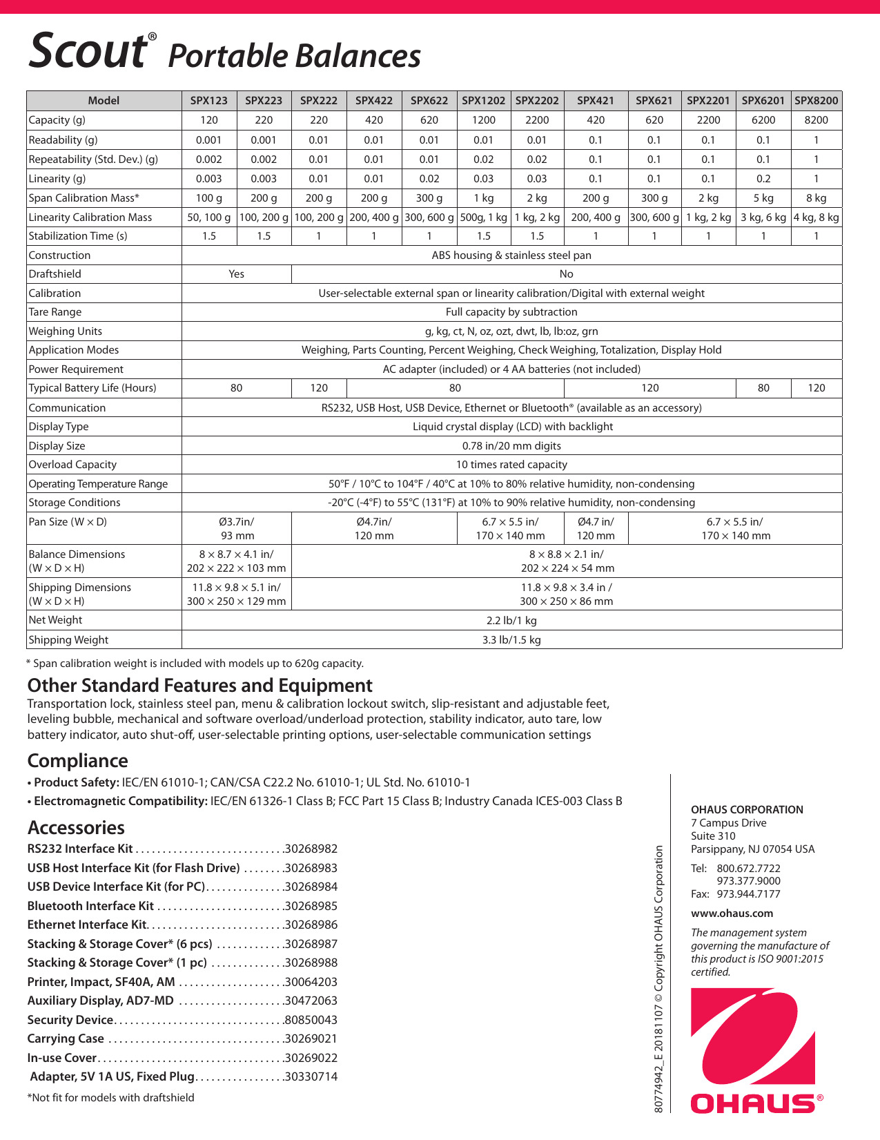 OHAUS SPX2201 Scout Portable Balance Especificaciones