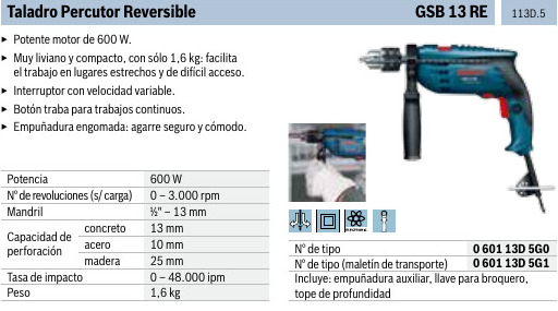 TALADRO PERCUTOR – > MARCA: BOSCH -> MODELO: GSB 13 RE ; REALIZAMOS ENVIOS A TODO EL PERU BOSCH ENTREGA INMEDIATA