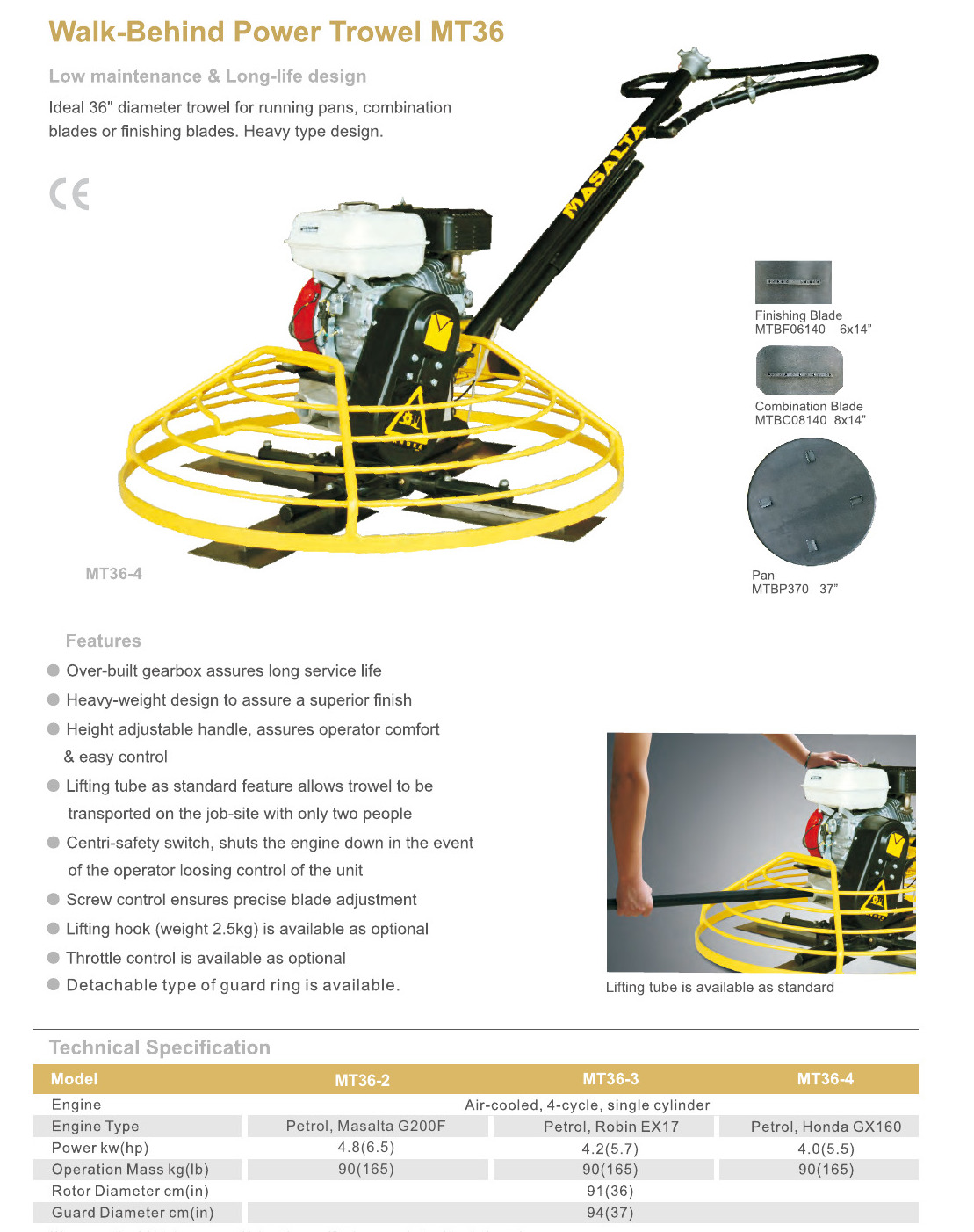 La llana Masalta MT36-4 está diseñada para nivelar superficies horizontales de concreto y es perfecta para lechadas rugosas y de acabado. La llana Masalta MT36-4 tiene el valor más práctico para un diámetro de 36 pulgadas (900 mm).