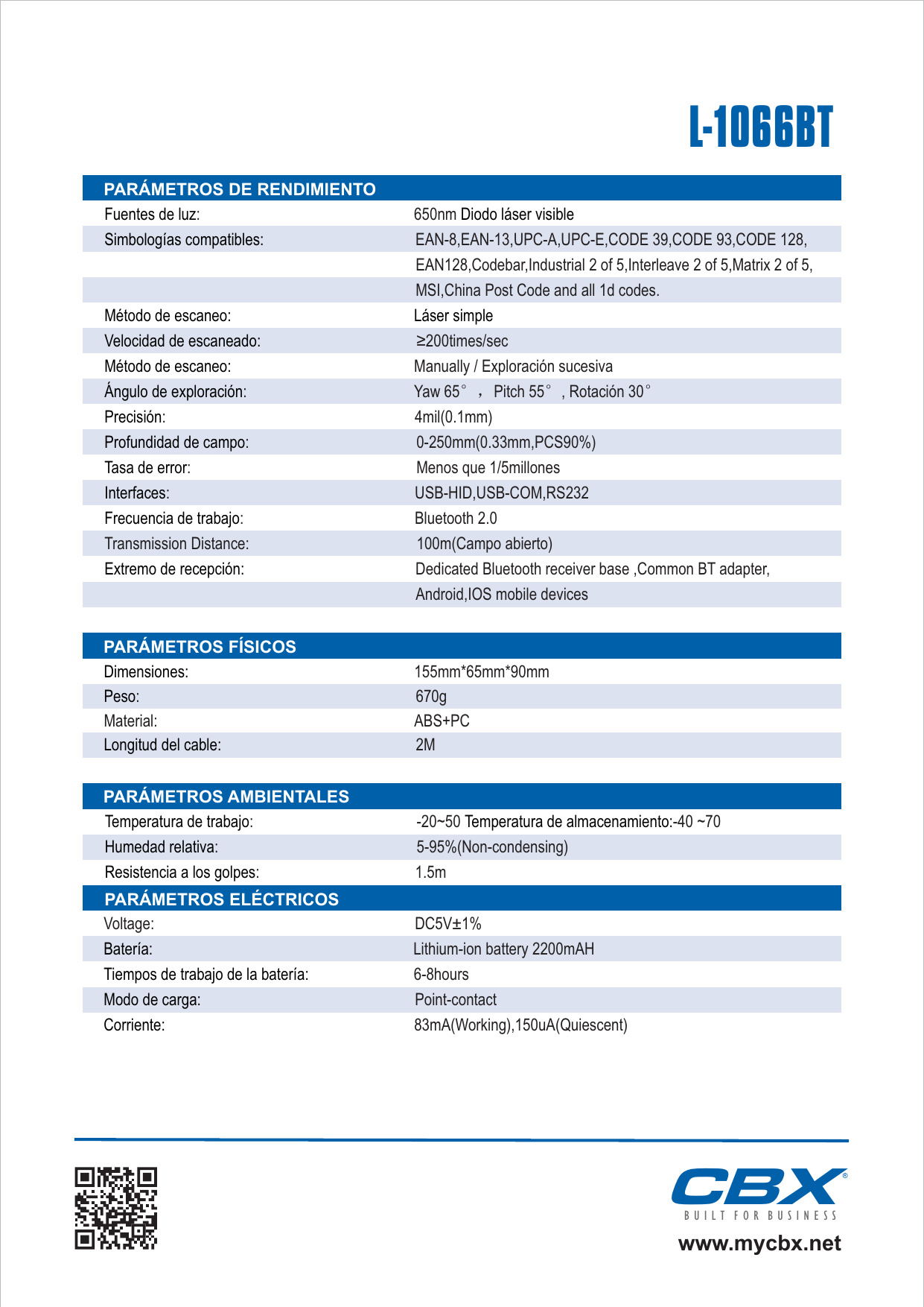 LECTOR LASER INDUSTRIAL,1D, WIRELESS, BT, USB,BLACK CBX L-1066BT