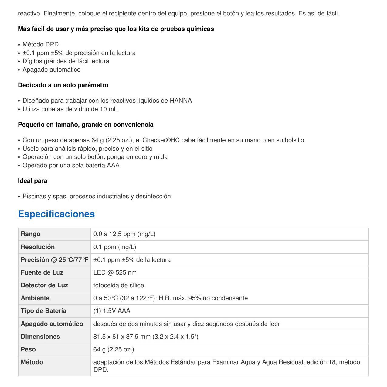El HI718 Checker ® HC (colorímetro de mano) ofrece una manera simple, precisa y rentable de medir el yodo. Presentado como una alternativa al cloro, el yodo como desinfectante disminuye la irritación de los ojos en piscinas y jugos y proporciona un nivel más estable de desinfección en condiciones adversas. Sin embargo, debido a sus propiedades tóxicas y corrosivas, el yodo se controla estrictamente. Diseñado como una alternativa más precisa a los kits de pruebas químicas, el HI718 brinda resultados rápidos y precisos en unos pocos y sencillos pasos.