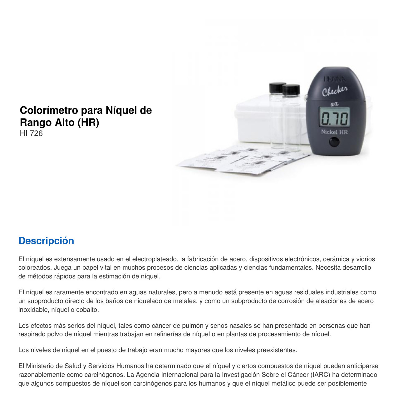 El HI726 Comprobador ® HC (orientable Colorímetro) proporciona una manera simple, precisa y rentable para medir níquel. Comúnmente utilizado por las industrias de la galvanoplastia y la batería, el níquel se controla activamente en las aguas residuales debido al daño que puede causar a las plantas y la vida acuática. Diseñado como una alternativa más precisa a los kits de pruebas químicas, el HI726 brinda resultados rápidos y precisos en unos pocos y sencillos pasos.