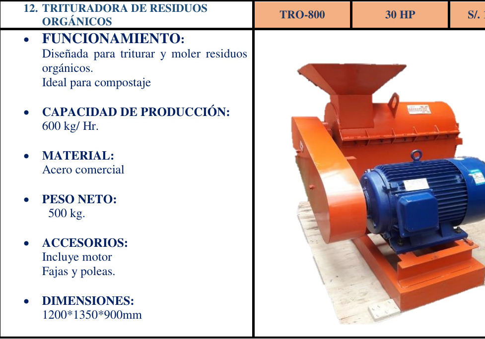 TRITURADORA – > MARCA: PERUMINOX -> MODELO: TRO-800 ; REALIZAMOS ENVIOS A TODO EL PERU PERUMINOX ENTREGA INMEDIATA