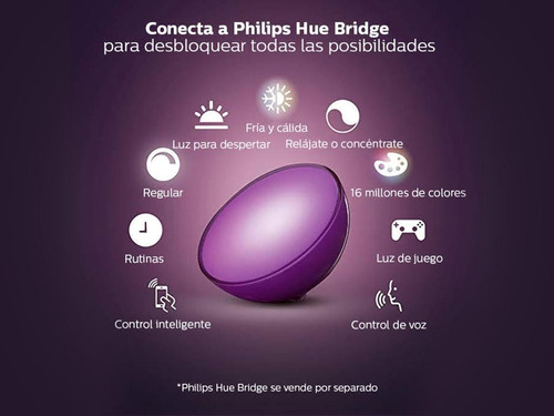 Añada una lámpara portátil Philips Hue Go con luz blanca y mas de 16 millones de colores para disfrutar.Ahora la V2, con Bluetooth y Zigbee, por lo que puede ser utilizado con su smpartphone y tablet sin necesidad del bridge.La lámpara Go tiene un elegante diseño con una carcasa transparente.Es inalámbrica, portátil y recargable y su batería tiene una duración de hasta 3 horas. Se controla a través del sistema de Hue con el bridge o mediante Bluetooth.